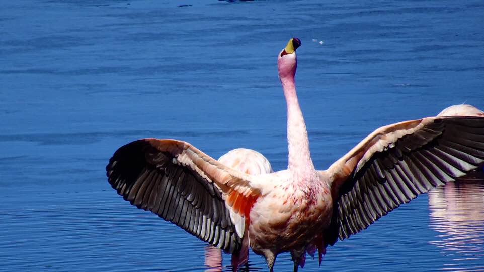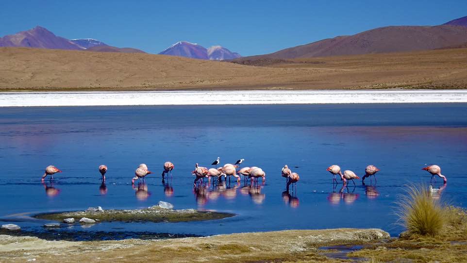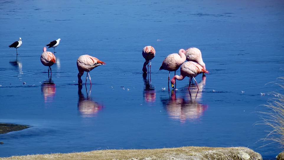 Wir sind heute an einigen schönen Lagunen vorbei gekommen, unter anderem die Laguna Canana, wo wir unsere ersten Flamingos sehen konnten. Beeindruckende Ausblicke auf die umliegenden Vulkane, blauen Seen mit weißer Salzkruste und rosarote Flamingos mittendrin…