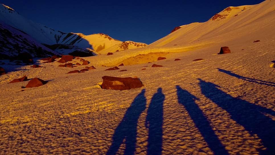 Hier sind wir im Morgengrauen sofort los und haben auch nahezu direkt unsere Steigeisen anziehen können. Unser lokaler Bergführer Julio hat gemeint, dass es heuer sehr viel Schnee hat.