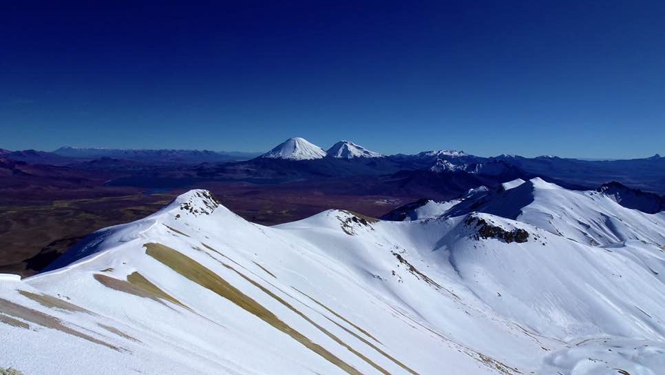 Die Aussichten auf die umliegenden Vulkane waren sagenhaft, schon während des Aufstiegs. Aber vor allem am Gipfel hatten wir einen 360° Blick auf die umliegenden Gipfel und Vulkane und auch Lagunen zu unseren Füßen. Vor allem der Parinacota, den wir morgen besteigen möchten und der mächtige Sajama, geplanter Höhepunkt unserer Reise, haben uns beeindruckt.