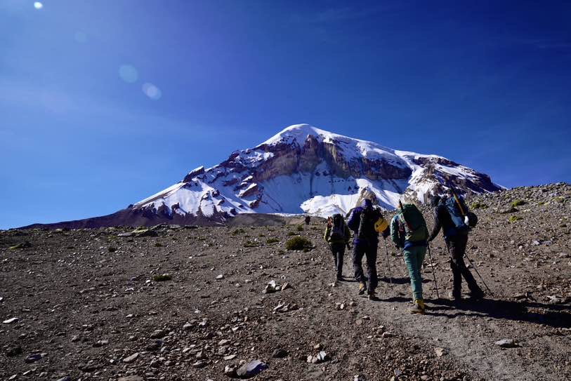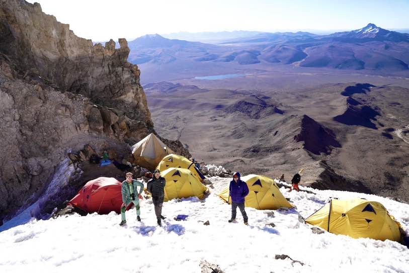 Dort haben schon unsere Träger gewartet und uns geholfen, die gesamte Ausrüstung in das Hochlager auf ca. 5700 Meter zu tragen. Selbst wenn wir nur eine Nacht im Hochlager verbringen, kommt mit den Zelten und der Verpflegung doch einiges zusammen. Auch hatte unser Koch Francisco einiges an Essen mit dabei, damit wir uns vor der Besteigung gut stärken können.