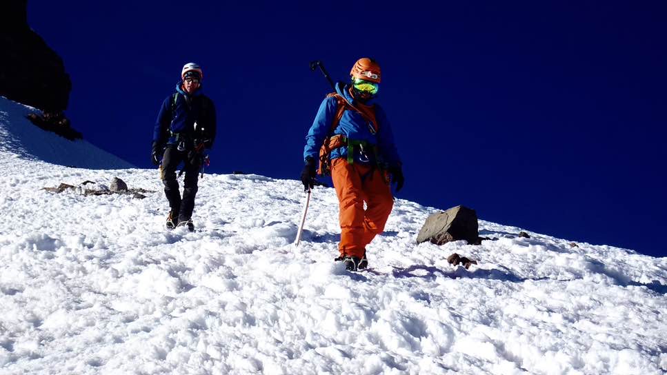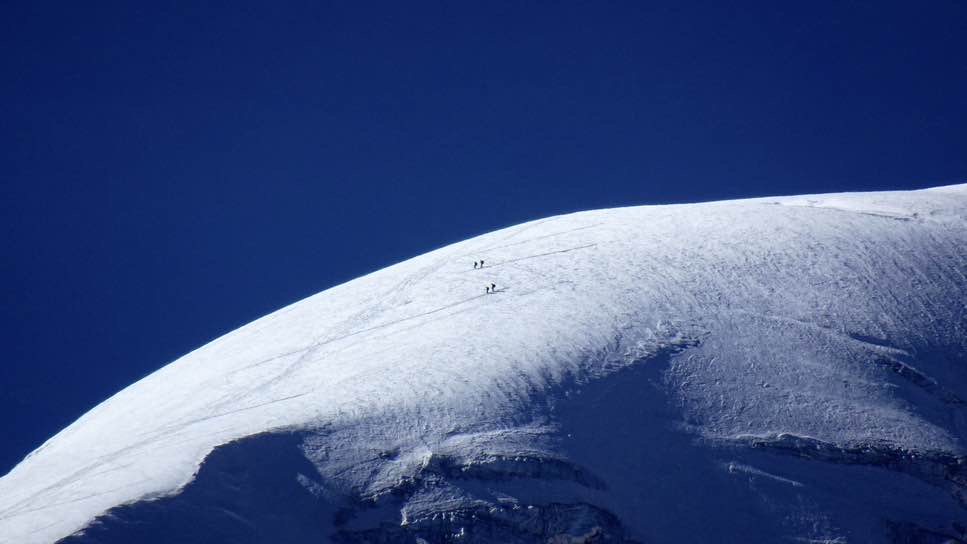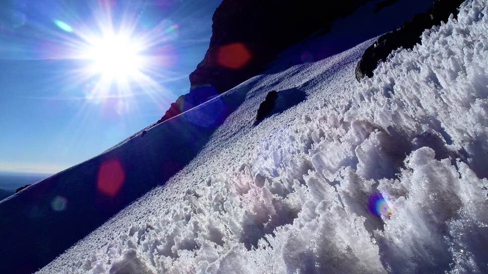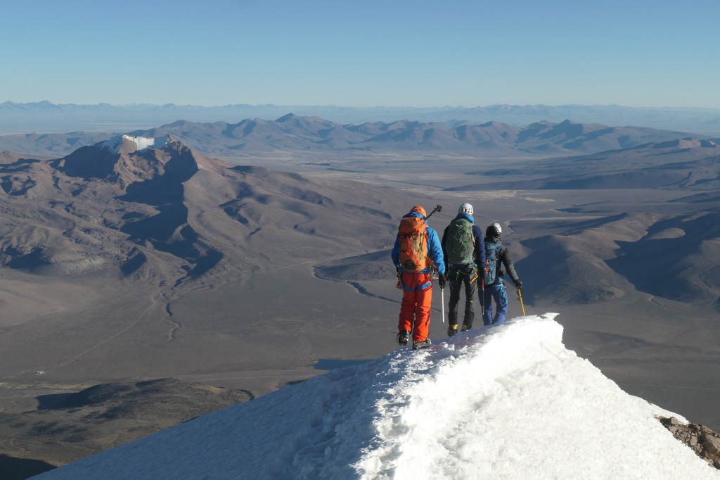 Und dann, auf einer Höhe von knapp 6000 Meter angekommen, fangen die eigentlichen Herausforderungen an: ein langer Gipfelhang, ohne Unterbrechung, ständig ca. 35 bis 45° steil, der in engen Serpentinen durch die zum Glück derzeit nur kleinen „Penitentes“ (Büssereis) bewältigt werden muss. Im Dunkeln gibt es gar keinen Anhaltspunkt und nur der Höhenmesser kann einem mitteilen, dass man zwar langsam aber doch stetig an Höhe gewinnt.