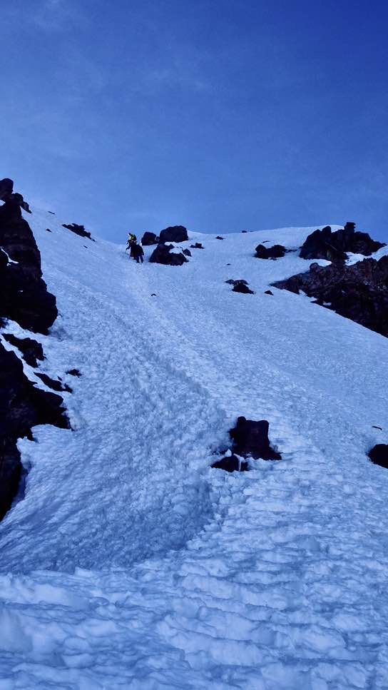 Der Sajama ist prinzipiell eher ein steiler Berg und sofort ab dem Lager mussten wir mit unserem Steigeisen in steilen Serpentinen durch kleines Büssereis aufsteigen. Nach einer guten Stunde hatten wir dann auch schon die sog. „Canaletta“ erreicht, ein ca. 50 Höhenmeter hohes, ca. 50 bis 55° steiles Schnee- und Eis Couloir, das die schwierigste Stelle der Besteigung darstellt.