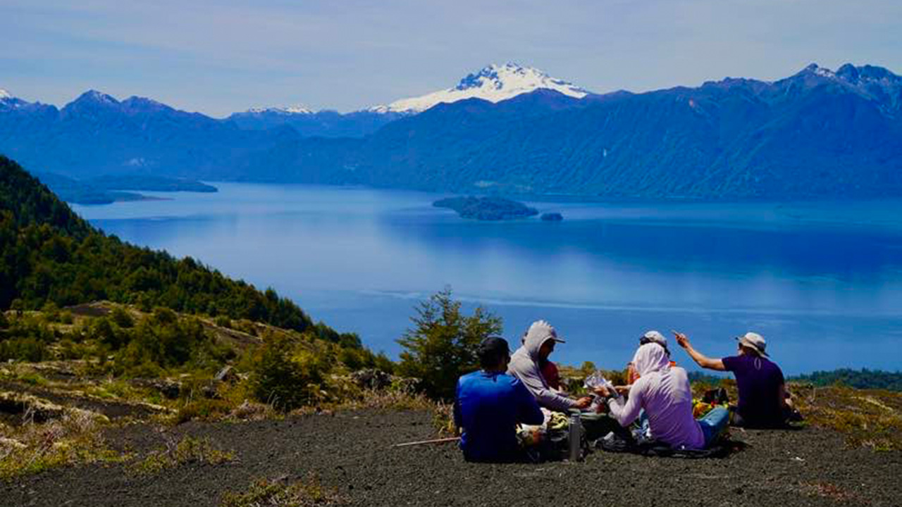 Wir konnten eine aussichtsreiche Mittagspause einlegen, mit beeindruckenden Blicken auf den Tronador, im Vordegrund der blaue Lago de los Santos und neben uns der kühne Kegel des Osorno, mit 2650 Metern Höhe der hier dominierende Berg.