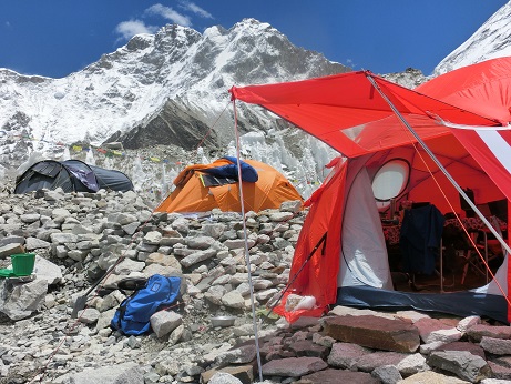 Das gesamte Basislager ist auf dem Khumbu Gletscher gebaut. Auf einer Art Seiten-Moräne bzw. auf einem schuttbedeckten Teil der Gletscherzunge, die sich unterhalb vom Khumbu Eisfall ca. 10 km nach Süden erstreckt, vorbei an Gorak Shep und an Lobuche.