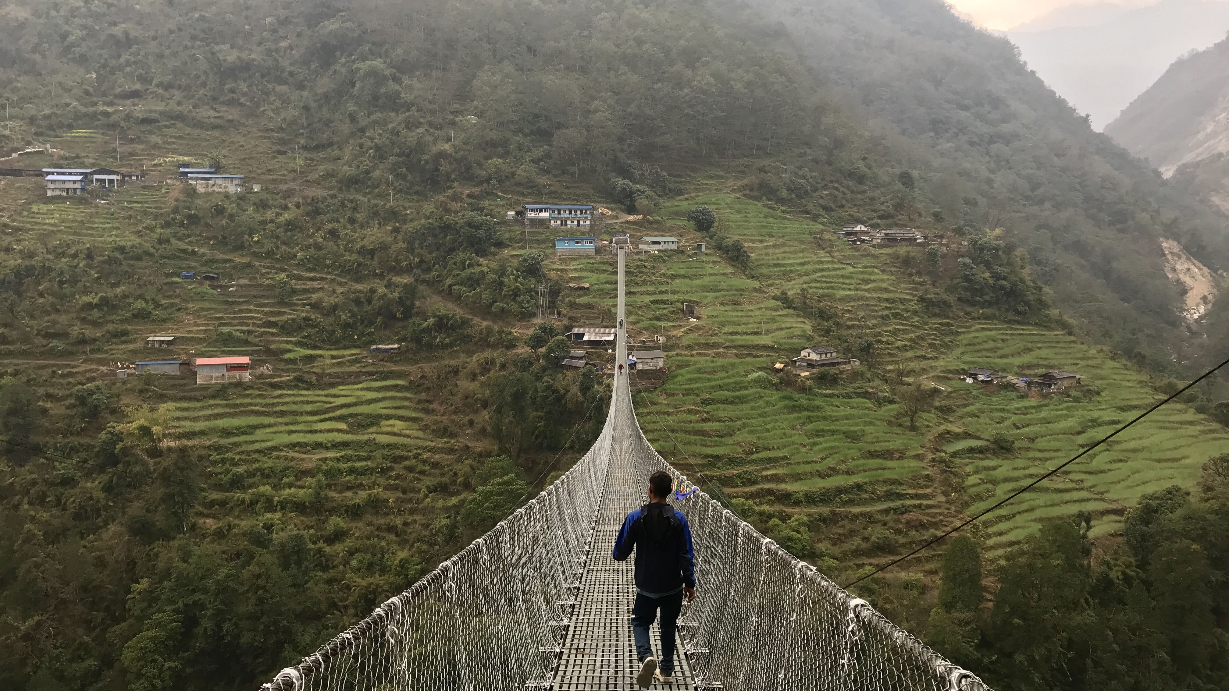 Wir starten in den Trek mit einer langen Passage entlang des Flusses „Modi Khola“ mit riesigen Bouldersteinen. Am Schluss steigen wir langsam auf und bewältigen unsere ersten 500 Höhenmeter.
