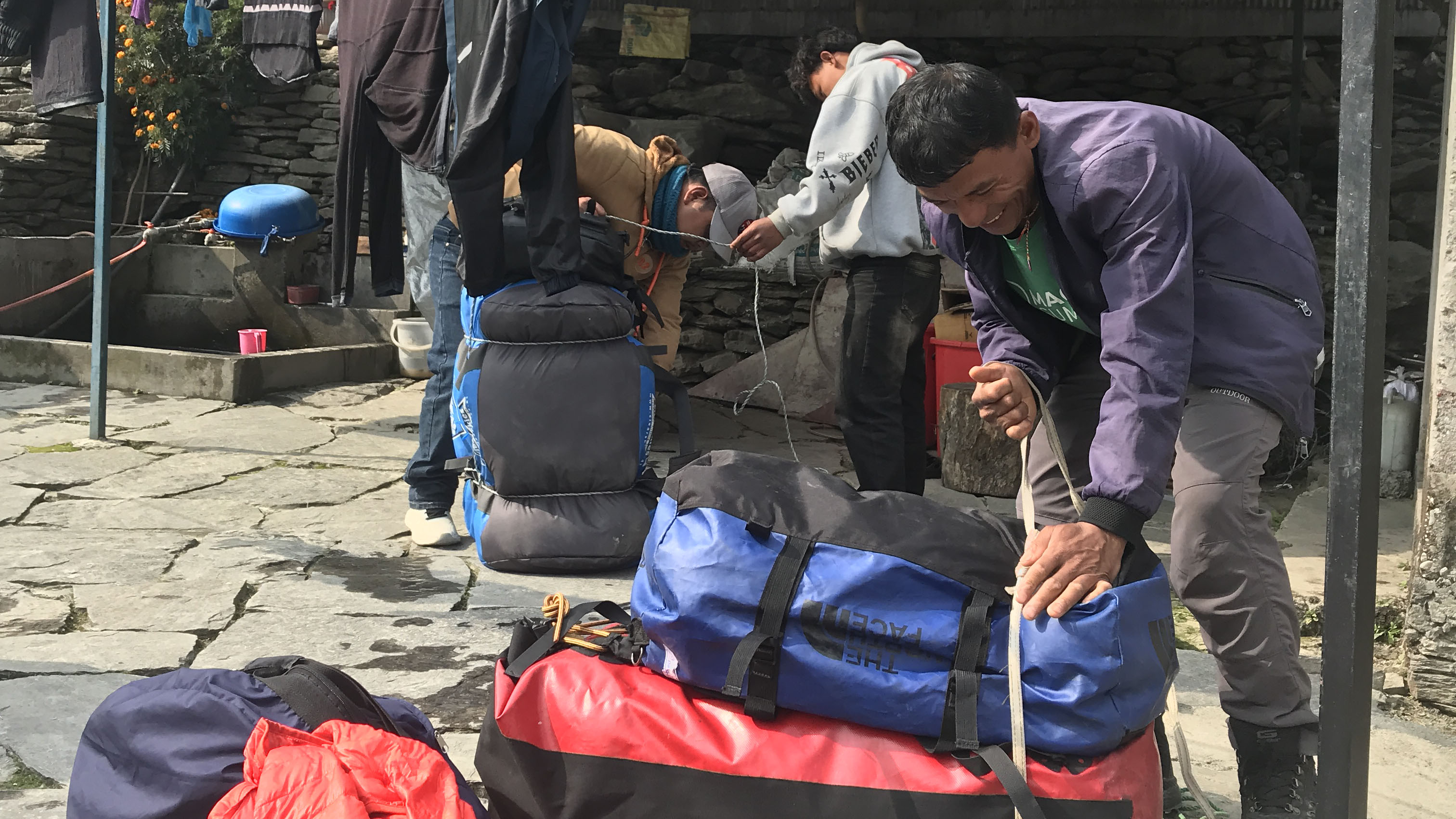 Gespannt beobachten wir, wie sie unsere Dufflebags mit Seilen zu Paketen umspannen und kompakt über eine Art Stirn-Geschirr aufladen, welches das Gewicht von den Schultern und Rücken etwas abnimmt. Gen, unser Guide erzählt mir später, dass sie bereits im frühen Kindesalter sich gefüllte Körbe bauen und aufspannen so dass ihre Rumpfmuskulatur anders ausgeprägt ist.