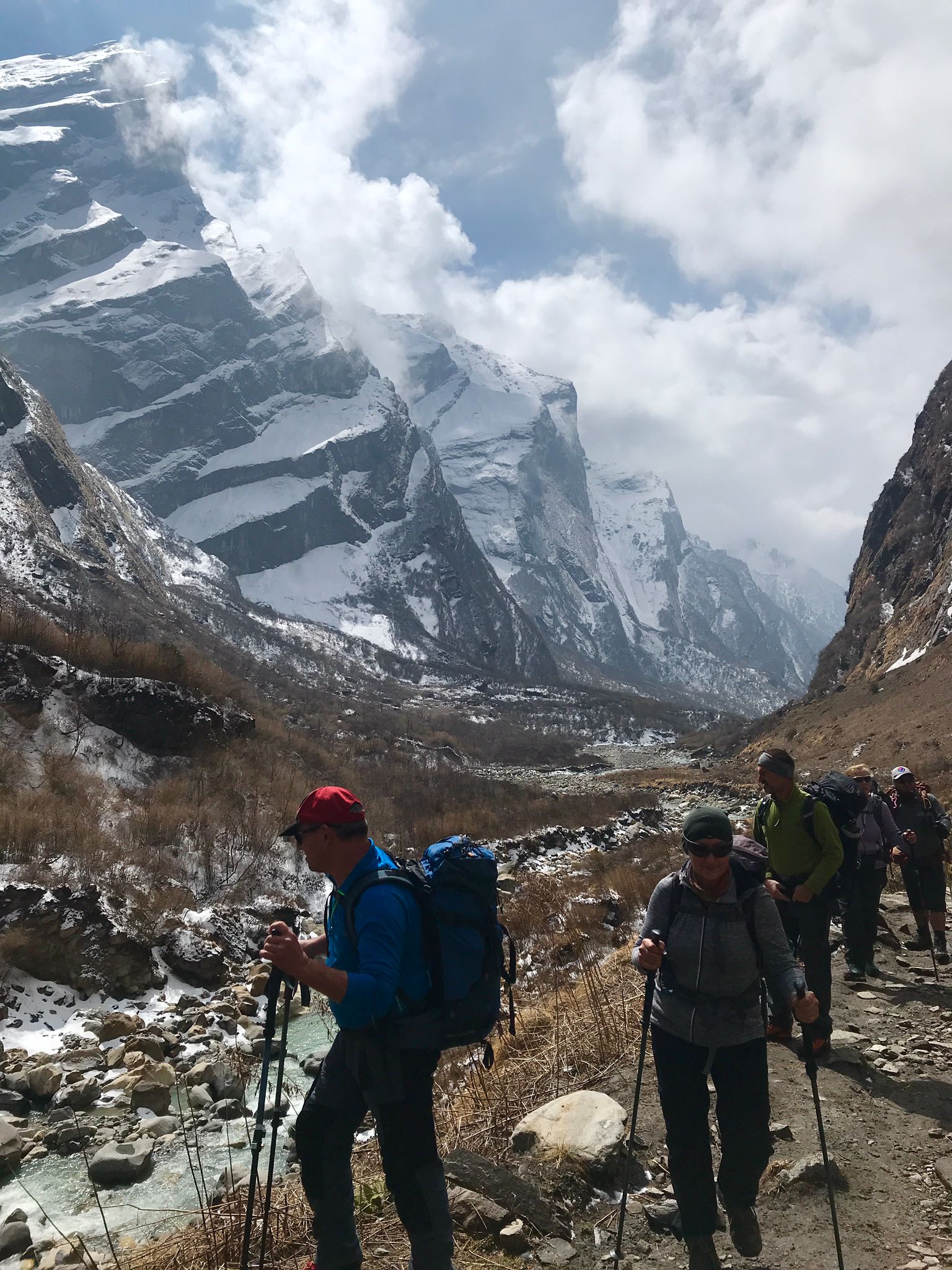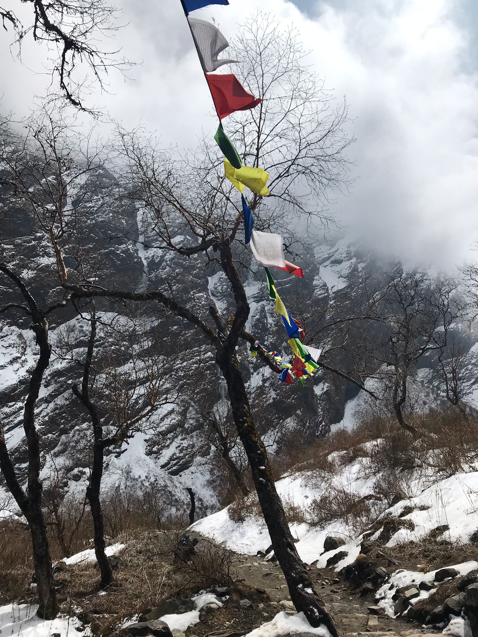 Es eröffnen sich unglaublich schöne Ausblicke auf die umliegenden Berge, auch den Gangapurna sehen wir in der Ferne. Wir gehen nun in sehr langsamen Schritten dem Camp entgegen. Die Luft wird dünner und die letzten Meter erfordern Einigen nochmal letzte Energie ab. Wieder zieht der dichte Nebel herein.