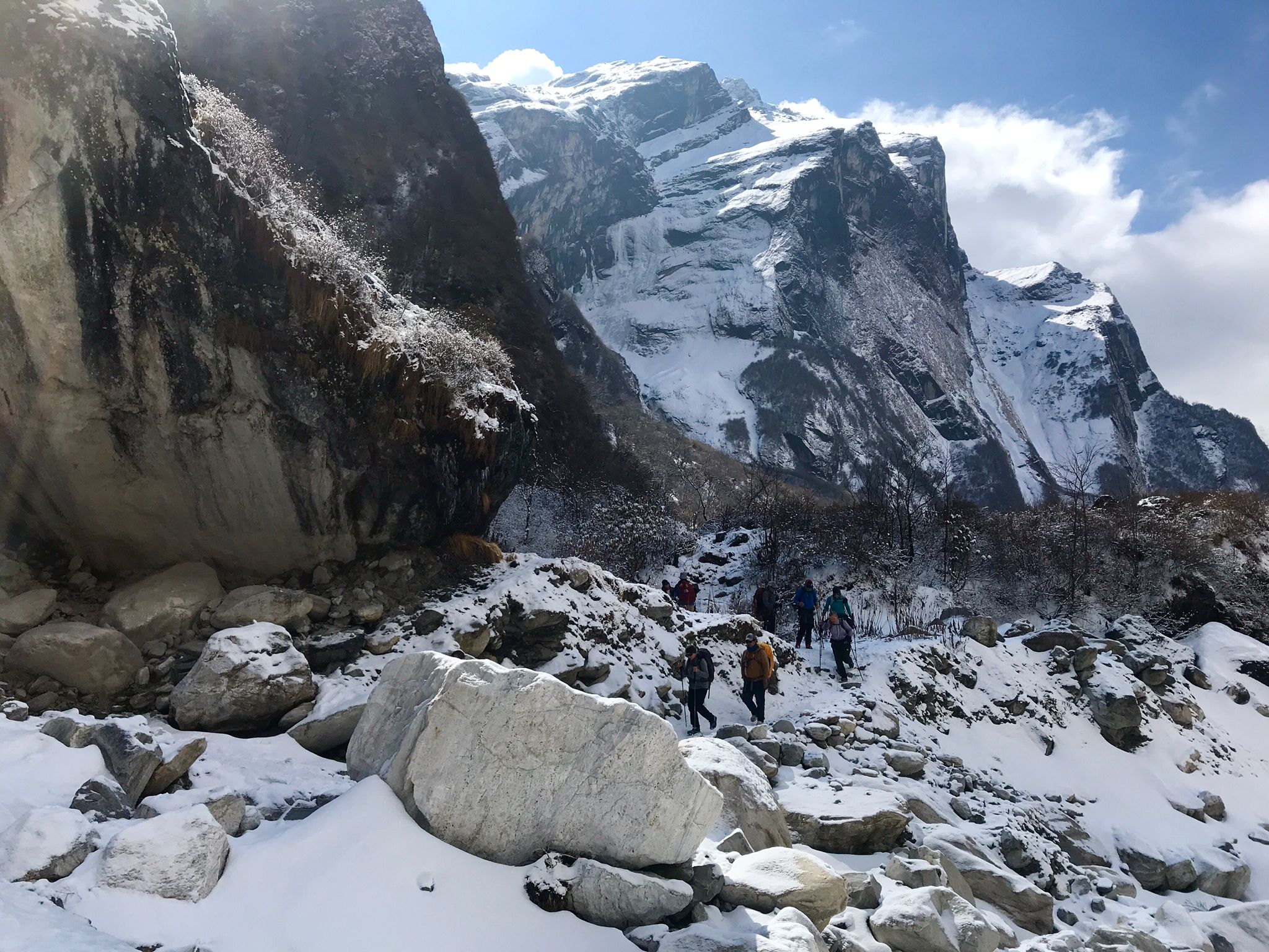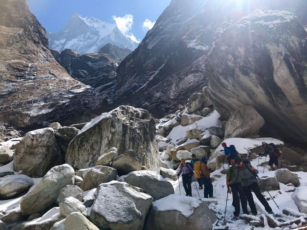 Heute brechen wir auf Richtung Machupuchare Base Camp, auch MBC genannt. Der Schneefall von gestern hat alles angezuckert, es gibt Frost, aber wieder haben wir blauen Himmel.