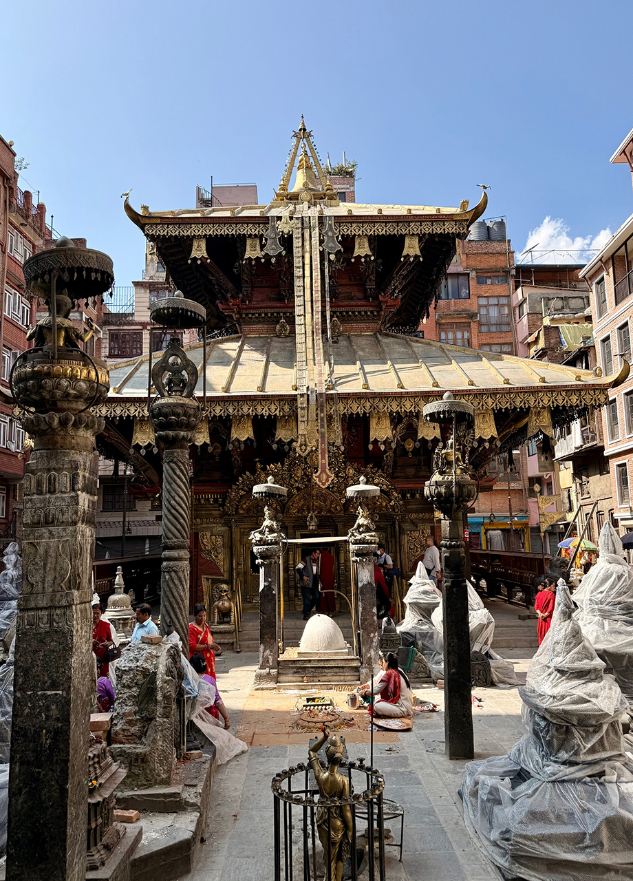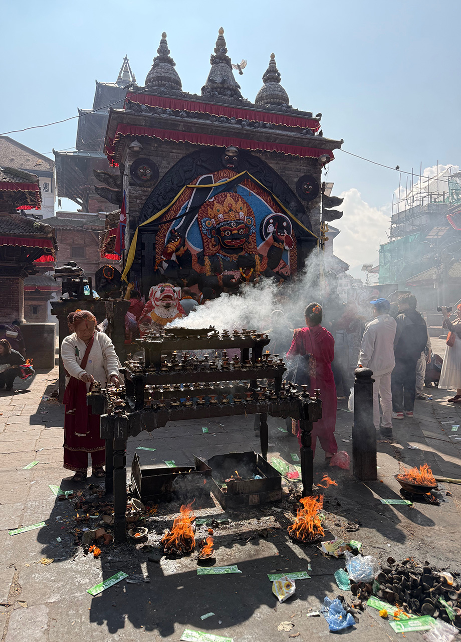 Nach einem köstlichen Frühstück habe ich gemeinsam mit einem unserer Teilnehmer den freien Tag in Kathmandu genutzt, um die Stadt auf eigene Faust zu erkunden, bevor der Rest der Gruppe eingetroffen ist. Die Straßen waren erneut voller Leben und bunt dekoriert, denn heute war der letzte Tag des Tihar Festivals. Eines der wichtigsten Feste Nepals, bei dem es vor allem um Dankbarkeit geht.