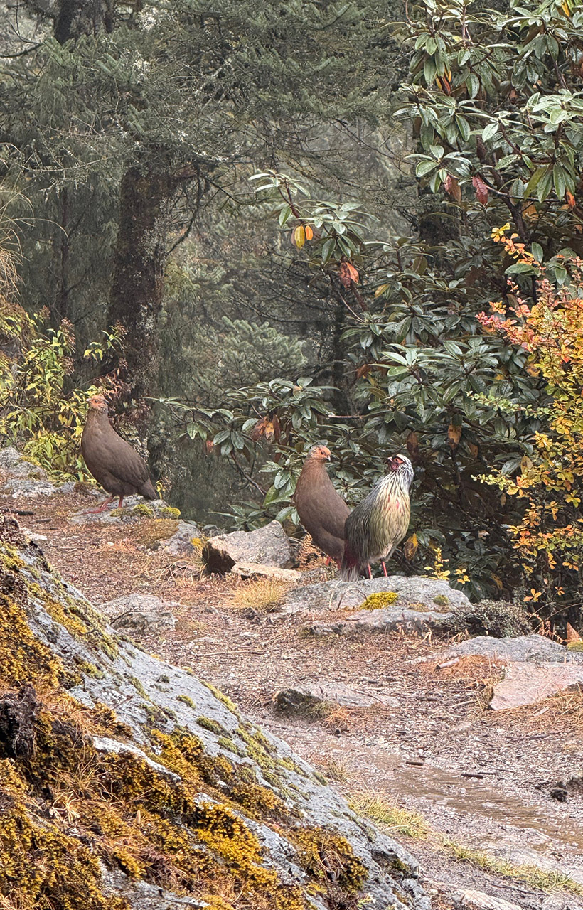 Von Thame aus stiegen wir zunächst rund 400 Höhenmeter ab, was etwa 2 Stunden dauerte. Nach einer kurzen Teepause begann anschließend der Aufstieg von etwa 420 Metern, für den wir rund drei Stunden benötigten. Unterwegs begegneten wir wieder zahlreichen Himalaya Glanzfasanen, diesmal nicht vereinzelt, sondern in ganzen Familienverbänden.