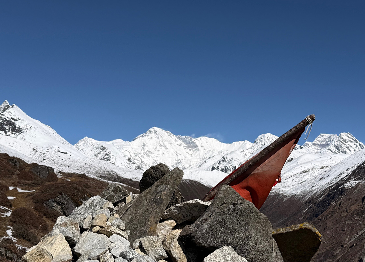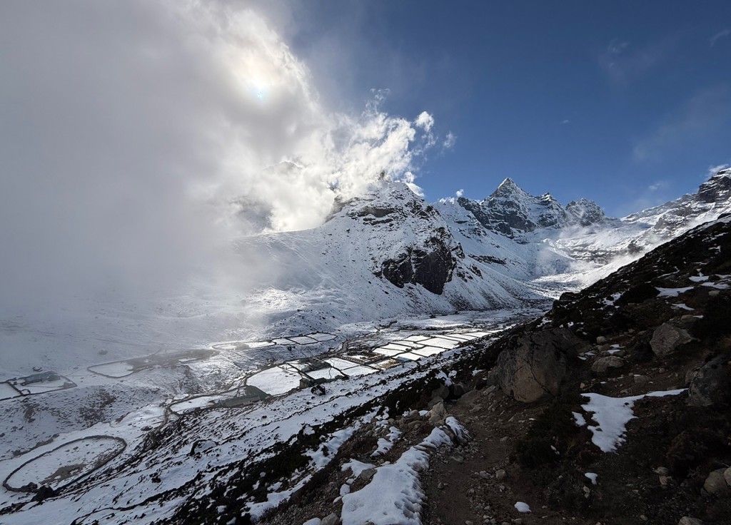 Nach dem Essen gönnten wir uns eine kurze Pause, bevor wir gegen 14:00 Uhr erneut aufstiegen, um einen besseren Blick auf den Machhermo auf 4470 m und den Cho Oyu 8201 m zu bekommen. Ursprünglich wollten wir nur etwa 120 Höhenmeter machen, doch das stabile Wetter motivierte uns, weiterzusteigen. Am Ende waren es über 200 Höhenmeter, und die Aussicht war diesen 8000er war definitiv wert.
