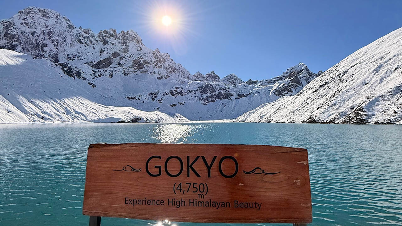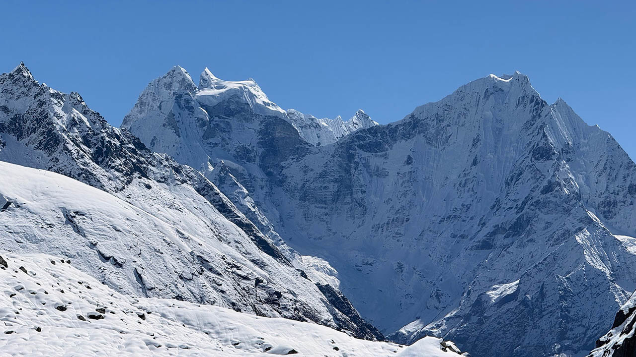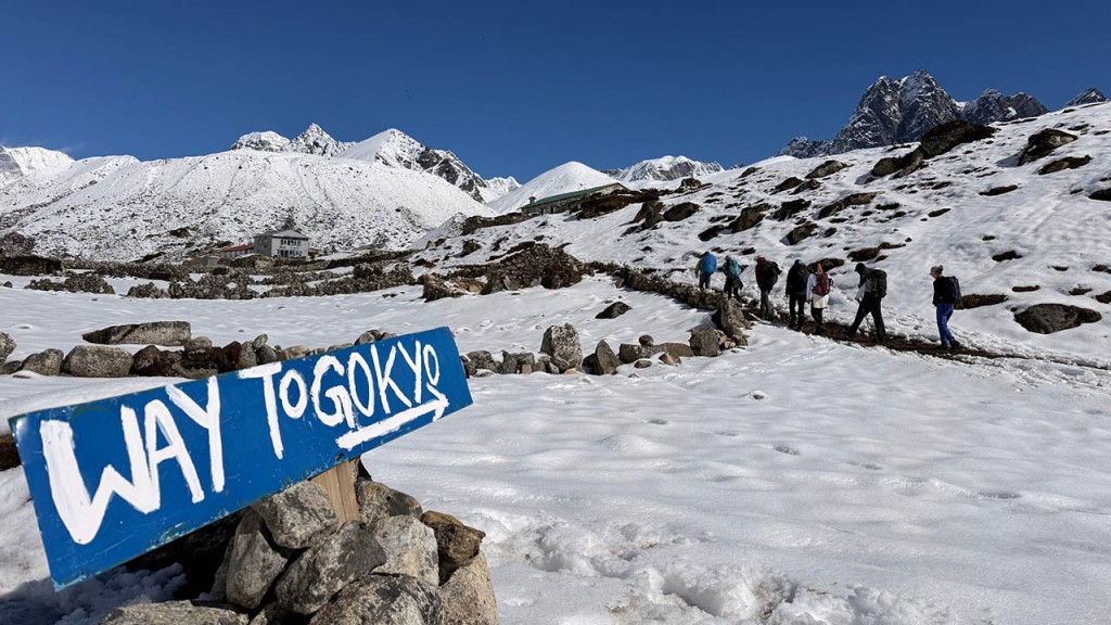 Auf dem Weg nach Gokyo beeindruckte uns die weiße, schneebedeckte Landschaft mit ihren zwei türkisblauen Seen und dem imposanten Cho Oyo auf 8201 Metern, der immer wieder für kurze Fotostopps sorgte.