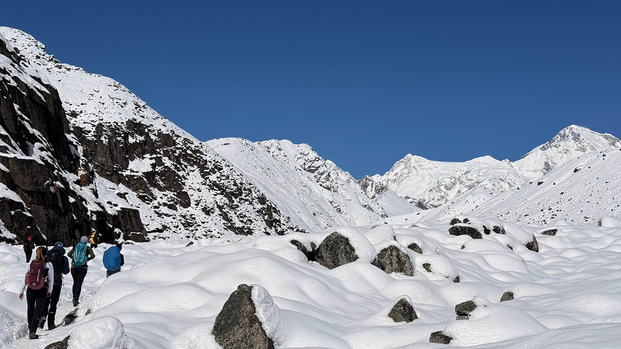 Wir starteten nach einer kleinen Stärkung den Aufstieg nach Gokyo. Aufgrund der zunehmenden Höhe merkten wir deutlich, dass selbst kurze Distanzen mehr Zeit in Anspruch nahmen. Es wurden regelmäßig Trinkpausen eingelegt. Das Wetter war hervorragend, keine einzige Wolke war am Himmel zu sehen. Durch die starke Sonneneinstrahlung und die Reflexion auf dem Schnee mussten wir uns ausreichend eincremen.