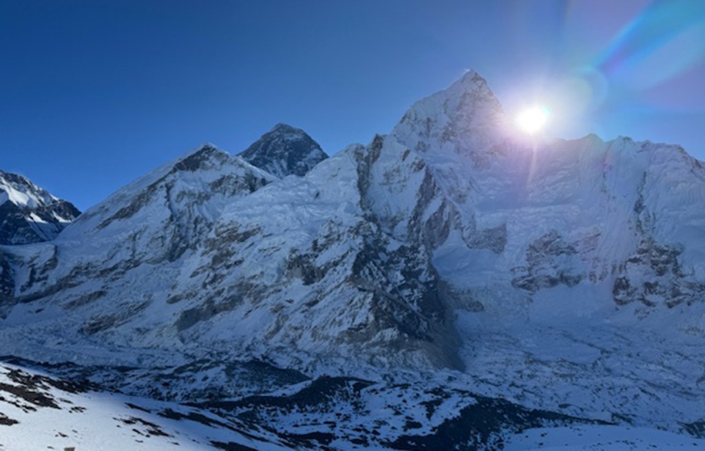 Oben angekommen wurden wir jedoch sofort von der Sonne begrüßt. Das Panorama war beeindruckend. Lohtse, Nupse und natürlich der Everest präsentierten sich in voller Klarheit, darunter der Khumbu Gletscher am Fuß dieser mächtigen Berge.