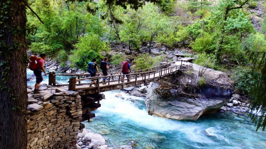 Je höher wir in diesem engen Tal aufsteigen, umso schöner und reizvoller wird es. Ein wunderschöner, reißender Bach, schöner Wald, mit großen, alten Nadelbäumen, etwas schilfartigem Bambus, stellenweise senkrechte Felswände. Kleine Holzbrücken und lange Hängebrücken… ein toller Einstieg in unser Trekking.