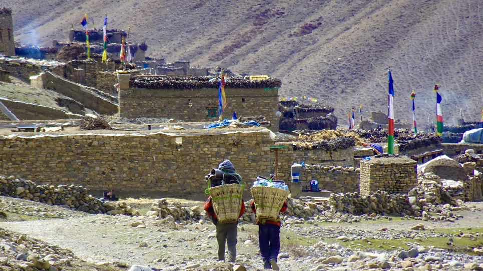 Nach einem wiederum gemütlichen Frühstück in der Morgensonne (Porridge, Pancakes…) sind wir vom kleinen Dorf Tokyu an vereinzelten Höfen innerhalb von ca. 1,5 Stunden nach Dho Tarap gewandert, der Hauptortschaft in dieser Region.