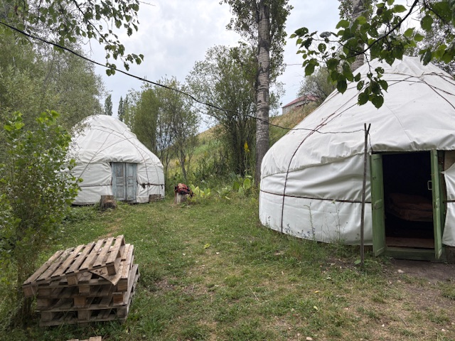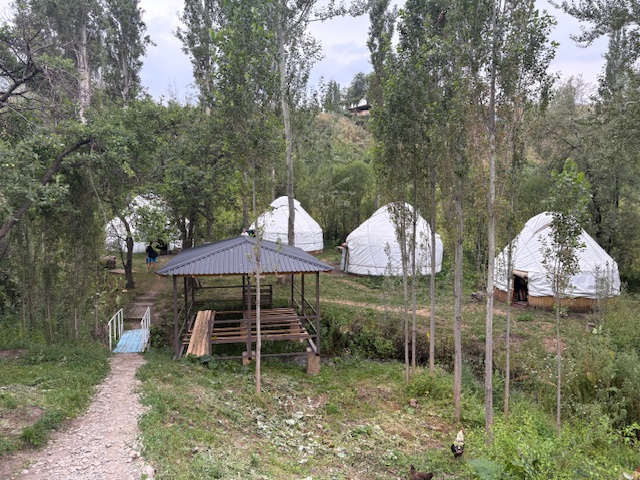 Jetzt haben wir im Garten unseres Homestay 5 traditionelle Yurten bezogen und werden in Kürze Abendessen.