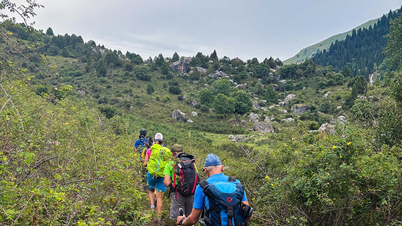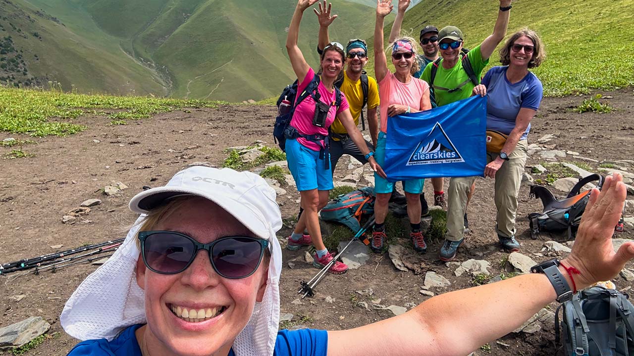 Während ein Teil der Gruppe im Lager blieb und auf die Pferdekarawane gewartet hat, sind ein paar von uns mit Anastasia zu einem kleinen Seitenausflug aufgebrochen. Wir sind den Fluss etwas weiter hinaufgewandert um dann in ein kleines Joch aufzusteigen. Viele schöne Blumen aber auch einige Wildrosen säumten unseren Weg und so sind wir etwas zerkratzt aber gut gelaunt oben angekommen. Vom Joch aus konnten wir den Belmonchok Pass direkt vor uns sehen, über den es morgen geht.