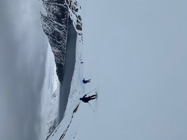 Die Wolken wurden immer dichter und die Sicht schlechter aber trotzdem haben wir alle eine kurze Skitour mit oder ohne Gipfel absolviert und sind anschließend in gutem Schnee bis zum Strand abgefahren.